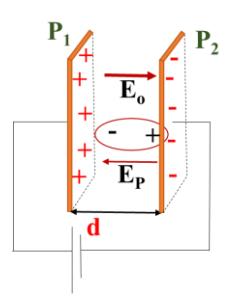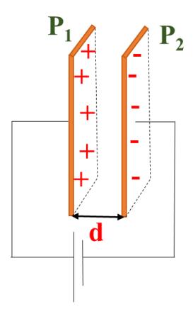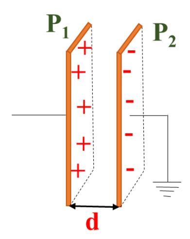 Let us consider two metallic plates P1 and P2 separated by a distance ‘d’ which is small as compared to the dimensions of plates. The plate P1 is given a charge +Q and the plate P2 is earthed as shown in figure above. When charge +Q is given to the plate , the charge -Q is induced on the inner face of plate and charge +Q on its outer face. When the plate is earthed, the charge +Q on its outer face is neutralized due to earthing. The charges +Q and -Q on plates and develop an electric field between them. If each plate has a uniform surface charge density , then electric field E between the plates is uniform and is given by