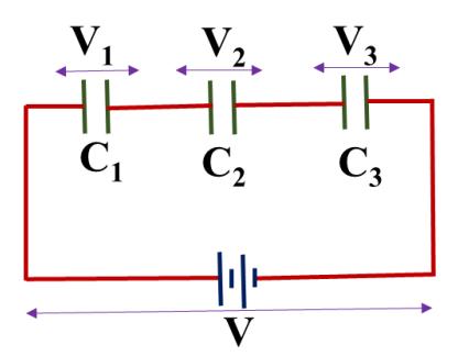 Let V1, V2 and V3 be the potential difference across C1, C2 and C3 respectively. Then,