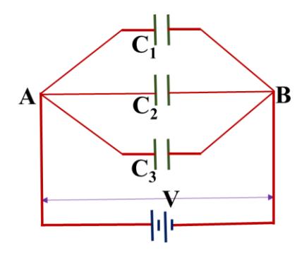 Section titled “(ii) Parallel Combinations of Capacitors:”The capacitors are said to be connected in parallel if positive plates of all the capacitor are connected together at one point and negative plates are connected together at the other point. In the figure given below three capacitors of capacitance , and are connected in parallel.
