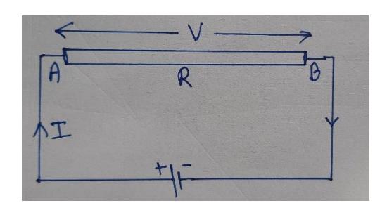 Let us consider a wire AB of resistance R in a circuit as shown in Fig. Let I be the steady current passing through it.