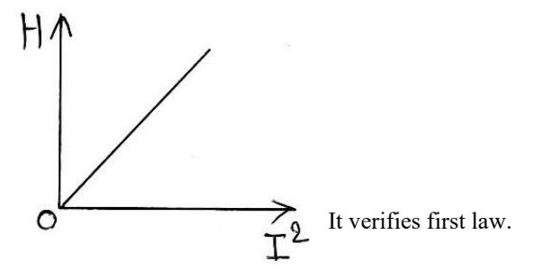 Section titled “(i) Verification of first law (i.e. H∝I2H \propto I^2H∝I2 )”Let ‘m’ be the mass of water in the calorimeter of water equivalent ‘W’, specific heat capacity of water is ‘S’.