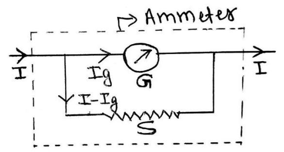 Let us consider a galvanometer of resistance ‘G’ and shows full scale deflection when an amount of current flows through it. We have to convert the galvanometer into an ammeter which can measure current upto ‘I’ ampere. For this, let us connect a shunt ‘S’ (a low value resistance) in parallel with the galvanometer.