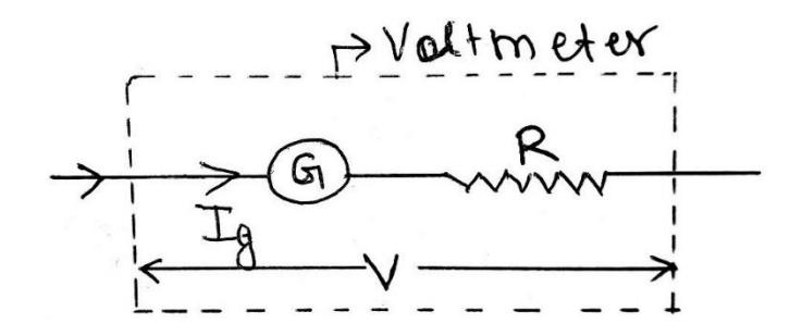 Section titled “Fig: Conversion of galvanometer into voltmeter”Let us consider a galvanometer of resistance ‘G’ and shows full scale deflection when an amount of current flows through it. We have to convert the galvanometer into voltmeter measure to measure potential difference upto V volt. For this, let us connect a high value resistance ‘R’ in series with galvanometer. Since galvanometer and high value resistance(R) are in series combination, so total resistance becomes R+G Now,