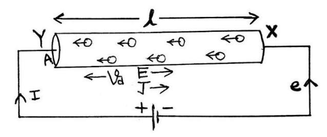 Let us consider a conductor XY of length ‘l’ and area of cross section ‘A’. Let ‘n’ be the number of free electrons per unit volume and ‘e’ be the charge on each electron. The conductor XY is connected with source (battery) in such a way that the end X is connected with negative terminal and Y is connected with positive terminal. When the conductor is connected with the source, the free electrons experience columbic repulsive force and they get accelerated. When free electrons get accelerated, a collision takes place between them and loses their velocity. By this process, the free electrons attain certain average velocity on moving from X to Y. The average velocity gained by electrons in specific direction on the application of electric field is known as drift velocity.