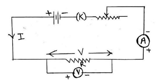The experimental setup for verification of Ohm’s law is shown in figure above. In the figure, a resistor of resistance ‘R’ is connected with a battery through ammeter (A), variable resistance ( ) and a key (K) as shown in a figure. A voltmeter (V) is connected across the resistor (i.e. in parallel with resistor). When circuit is open, no current flows through it and the ammeter and voltmeter do not show any reading. When circuit is closed, an amount of current flows through the circuit measured by ammeter and corresponding potential is measured by voltmeter. Now, the value of current in the circuit is changed with the help of variable resistance (rheostat, ). Let be the