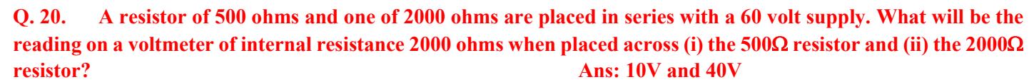Section titled “Q. 19. Two resistors of resistance 1000Ω1000\Omega1000Ω and 2000Ω2000\Omega2000Ω are joined in series with a 100V supply. A voltmeter of internal resistance 4000Ω4000\Omega4000Ω is connected to measure the potential difference across 1000Ω1000\Omega1000Ω resistor. Calculate the reading shown by the voltmeter.”Ans: 28.57V