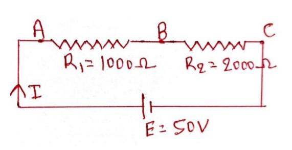 Section titled “Q. 21. Two resistance of 1000Ω1000\Omega1000Ω and 2000Ω2000\Omega2000Ω are placed in series with 50V mains supply. What will be the reading on a voltmeter of internal resistance 2000 Ω\OmegaΩ when placed across the 1000 Ω\OmegaΩ resistor? What fractional change in voltage occurs when voltmeter is connected? Ans: 12V, 25%”Given,