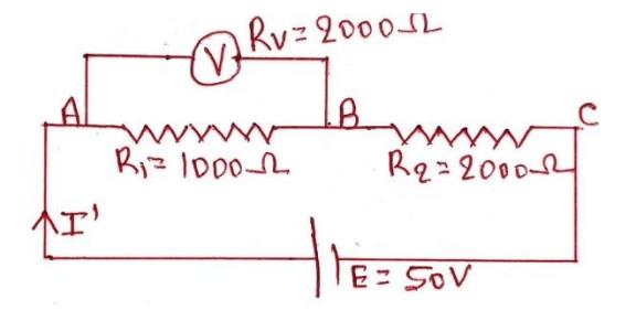 Let I’ be the current flowing in the circuit when voltmeter is connected.