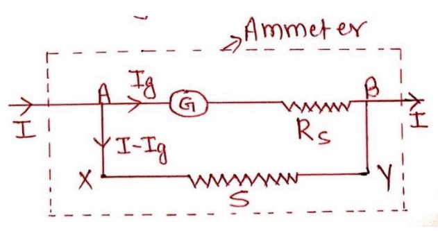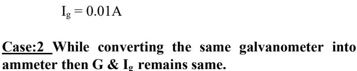 Section titled “# Conversion of galvanometer into an ammeter:”Since, galvanometer and shunt are in parallel combination, ∴ p.d. across shunt (S) = p.d. across galvanometer (G)