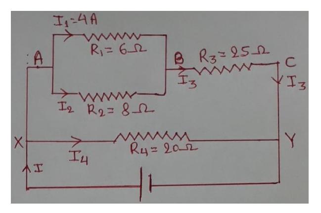 Section titled “Q.9. Consider the figure below. The current through 6Ω6\Omega6Ω resister is 4A in the direction shown. What are the currents through the 25Ω25\Omega25Ω and 20Ω20\Omega20Ω resistors?”