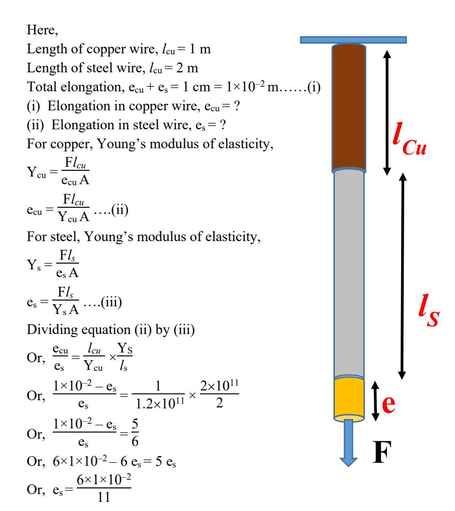 ∴ Elongation in steel wire, es=5.45×10−3m. and elongation in copper wire, ecu=1×10−2−5.45×10−3=4.54×10−3m